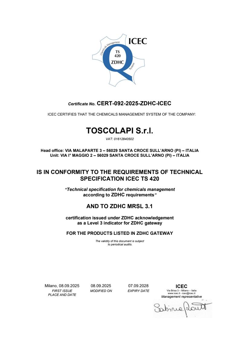 Toscolapi S.r.l. ha ottenuto la certificazione ICEC TS 420 in conformità ai requisiti ZDHC MRSL 3.1, a riconoscimento dell’efficacia del proprio Sistema di Gestione delle Sostanze Chimiche. La certificazione, rilasciata con riconoscimento ZDHC come Level 3 Indicator per lo ZDHC Gateway, attesta l’impegno dell’azienda nel controllo e nella gestione responsabile delle sostanze chimiche lungo il processo produttivo, in linea con gli standard internazionali di sostenibilità e sicurezza.