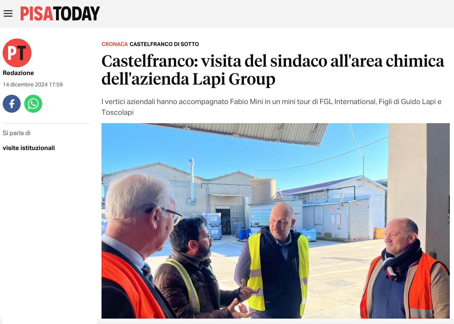 Castelfranco: visita del sindaco all’area chimica dell’azienda Lapi Group (Pisa Today – 14 dicembre 2024)