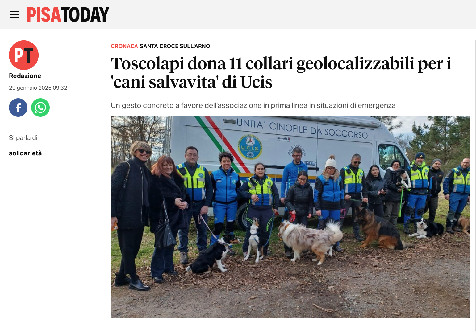 Toscolapi dona 11 collari geolocalizzabili per i “cani salvavita” di Ucis (Pisa Today – 29 gennaio 2025)